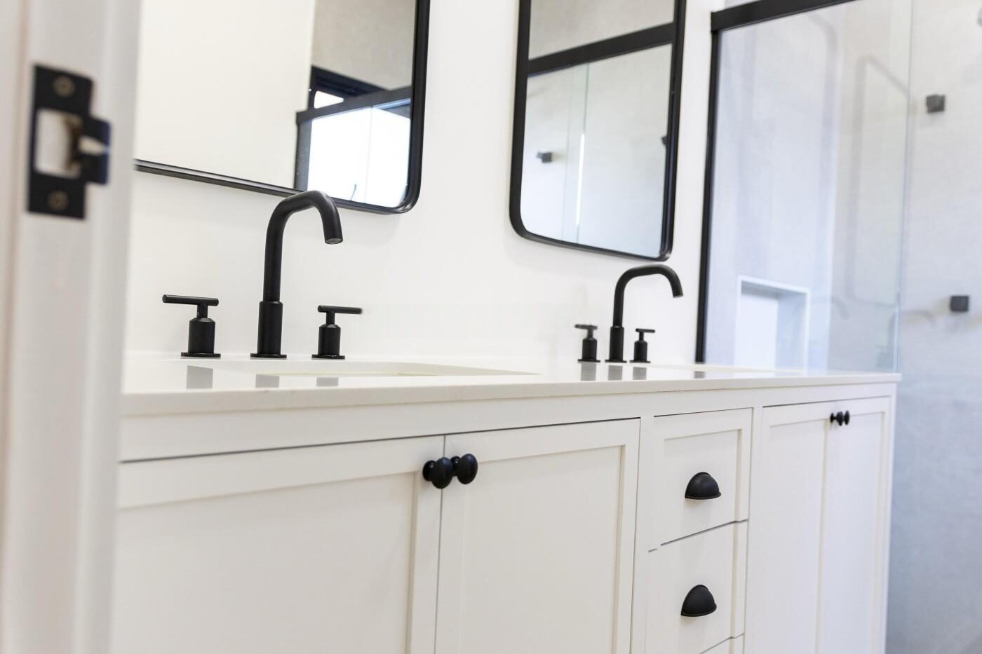 🛁 Banheiros completos com box, espelhos, armários e cuba dupla no banho máster