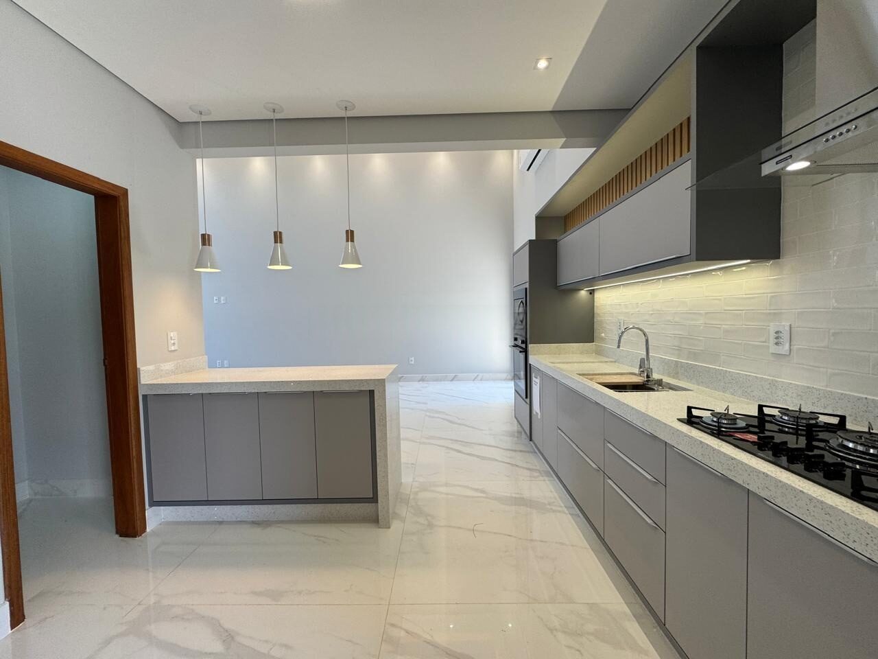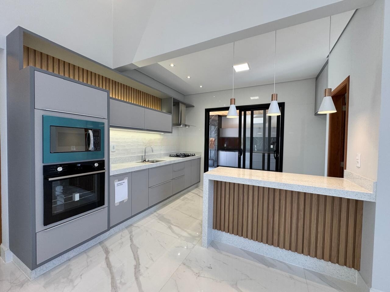 Cozinha planejada e equipada com cooktop, coifa, micro-ondas e forno elétrico.