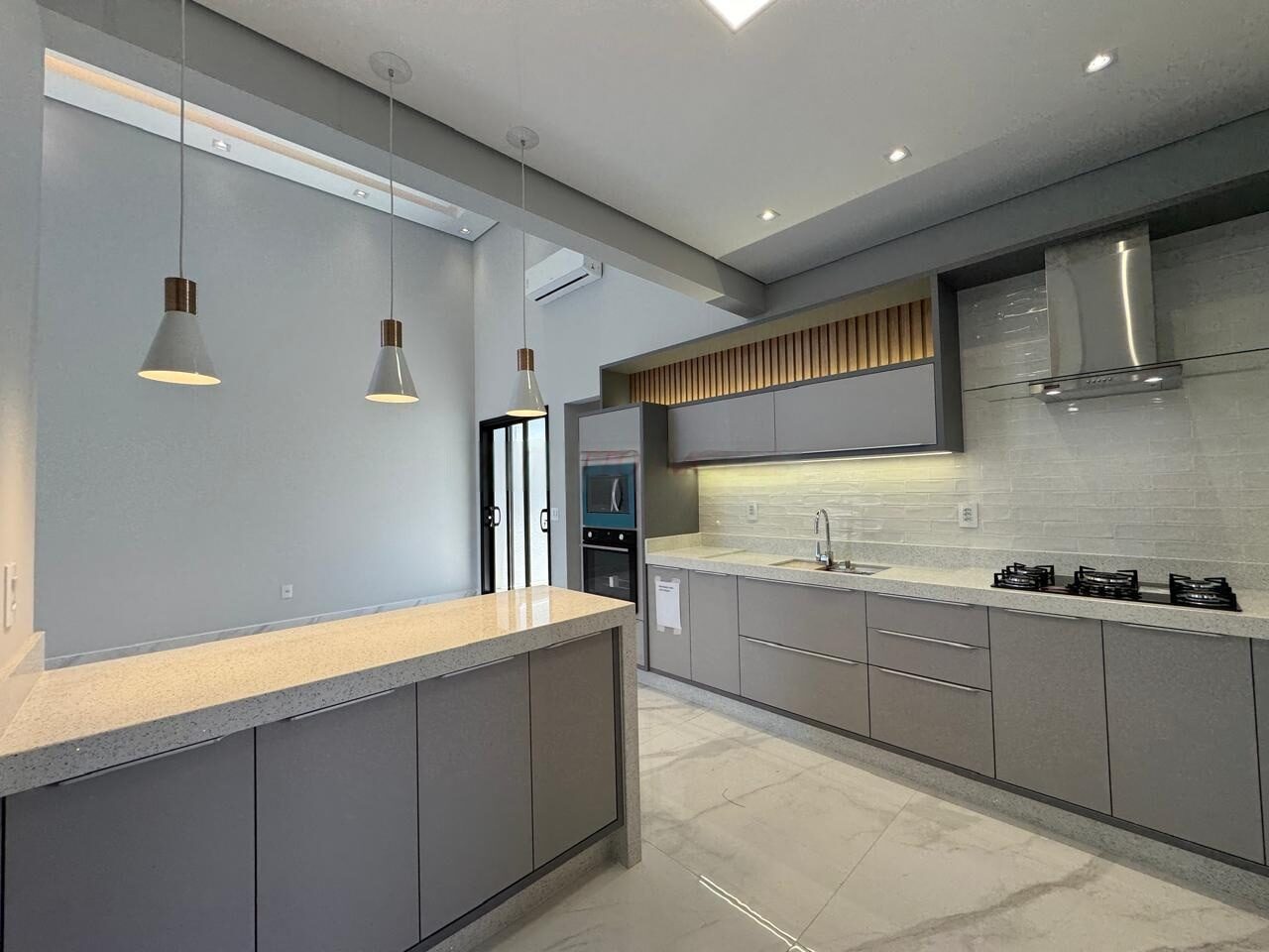Cozinha planejada e equipada com cooktop, coifa, micro-ondas e forno elétrico.