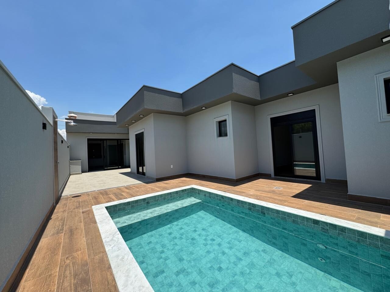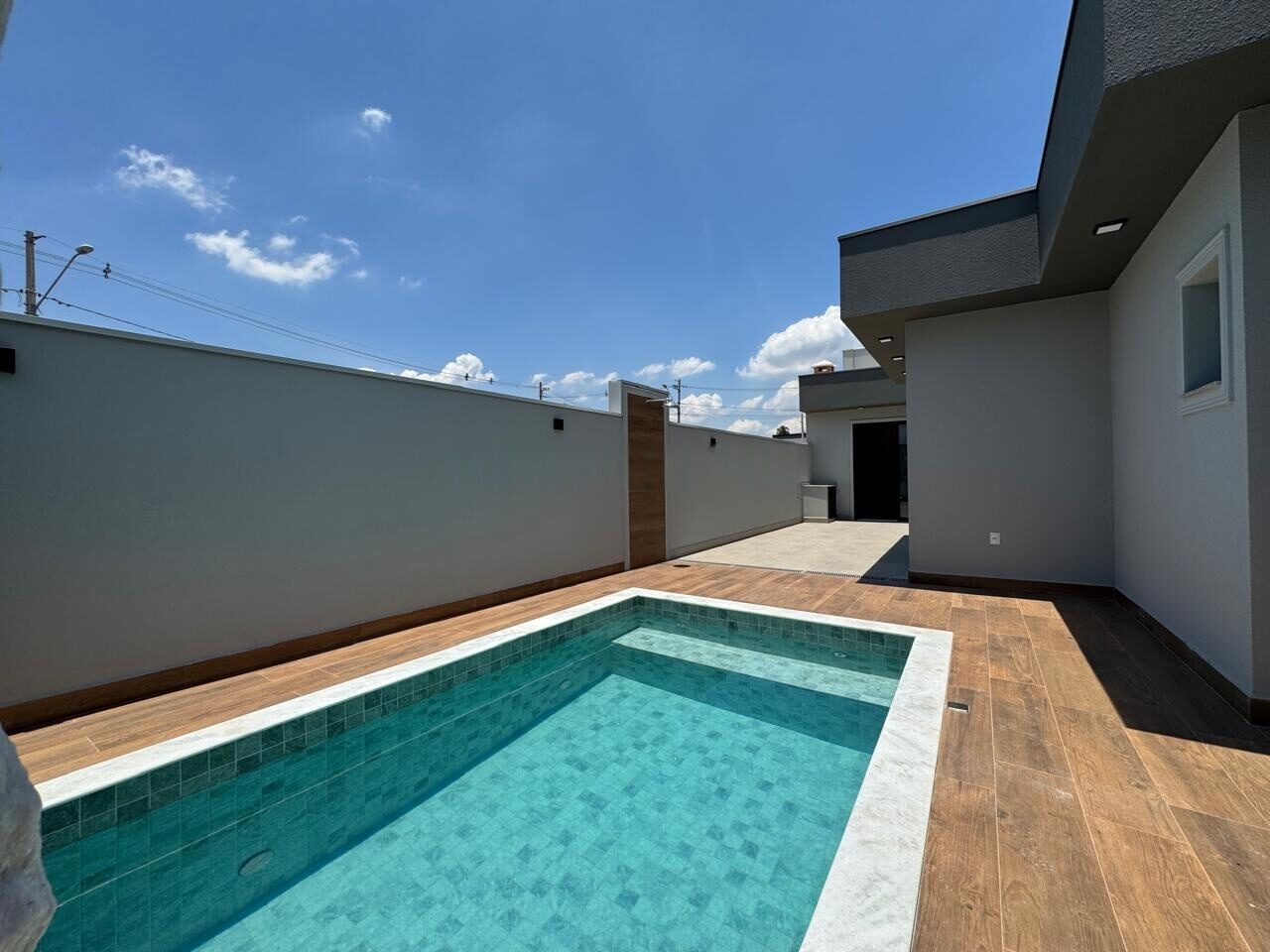 Piscina com aquecimento solar, cascata e luz de led;