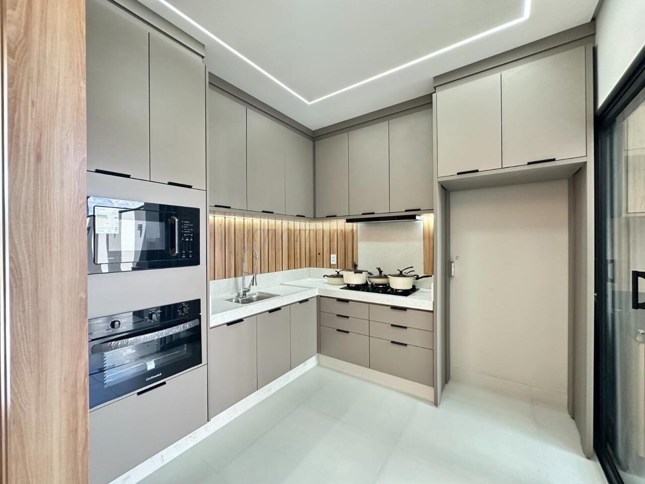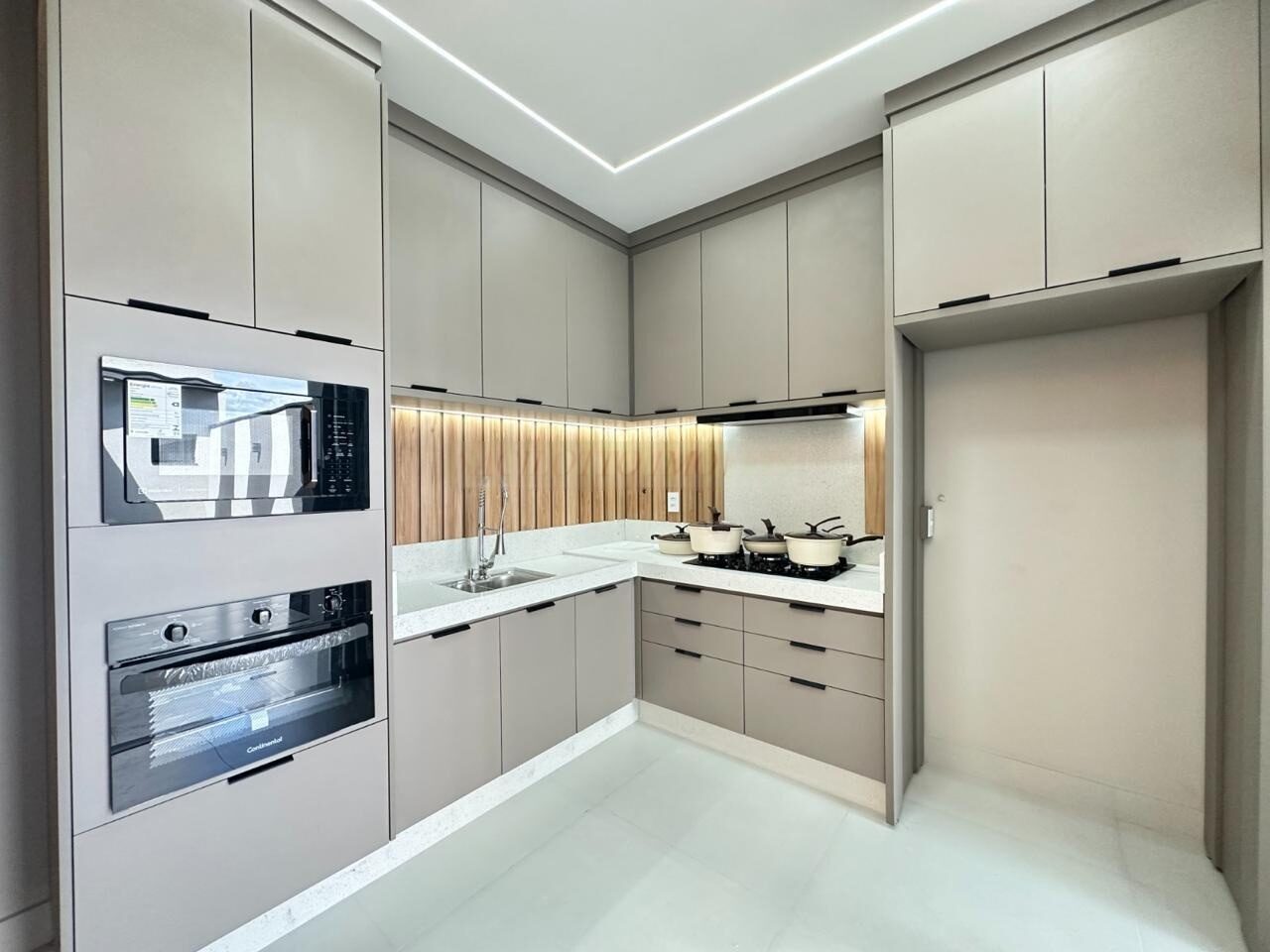 – Cozinha com armários, cooktop, forno microondas, forno elétrico e depurador de ar